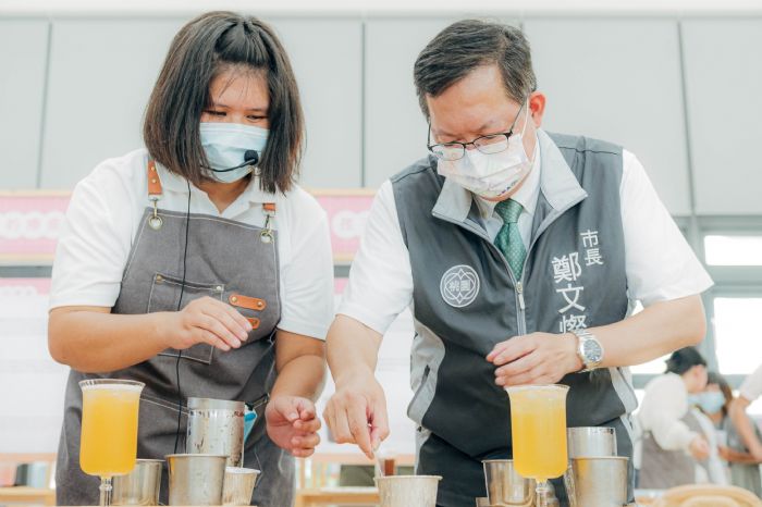 由桃姊妹帶領市長及貴賓製作「荔枝綠茶」手作特色調飲,展現3個月技能培力的成果與自信。(桃園市政府)