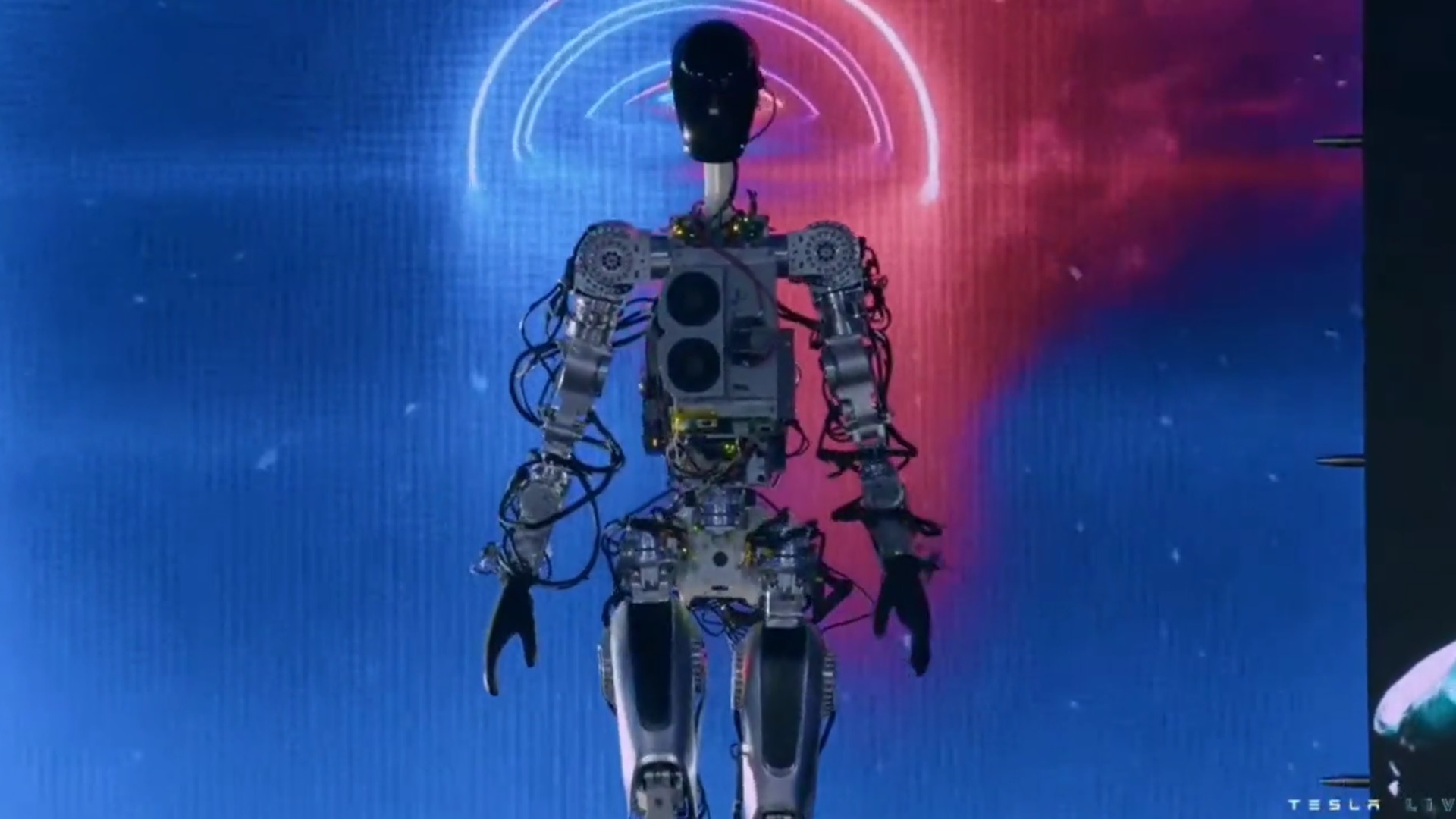 揭幕後,Optimus原型機器人緩步走上前,向台下坐著的觀眾揮手致意。現場也播放一段關於Optimus的影片。片中,Optimus交付包裹、替植物澆水,並在特斯拉工廠中將金屬棒裝箱。