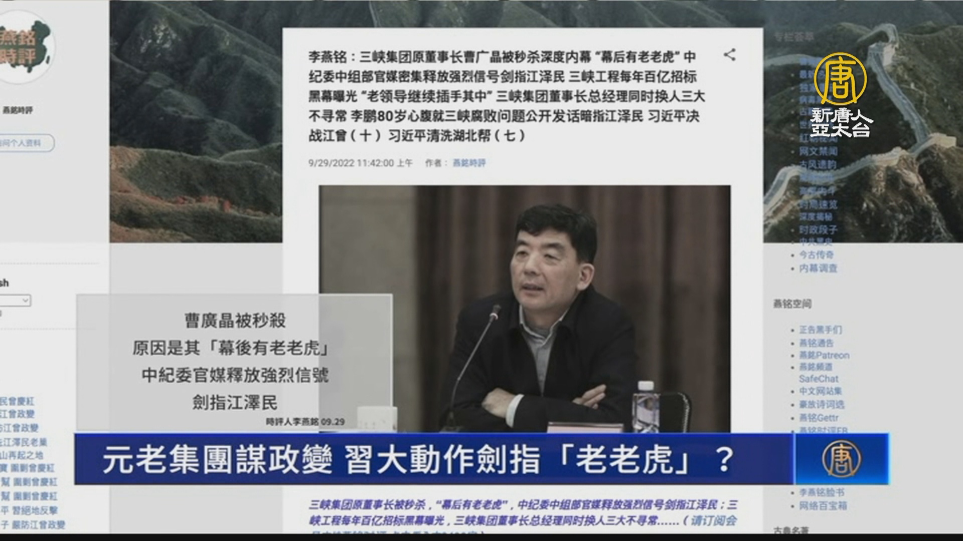 時評人李燕銘29號評論說,曹廣晶被秒殺,原因是其「幕後有老老虎」,中紀委官媒釋放強烈信號,劍指江澤民。