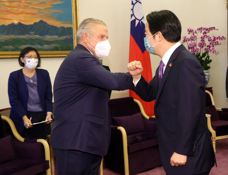 副總統賴清德(圖右)3日在總統府接見德國國會友台小組主席威爾許(Klaus-Peter Willsch,另譯:魏爾胥)(圖左2)訪團,兩人碰肘致意。(圖/中央社)