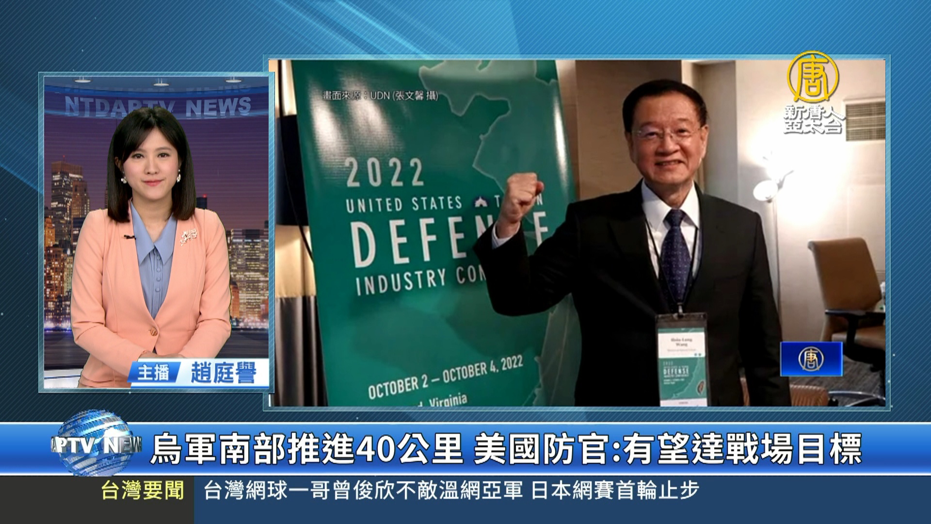 【新唐人亞太台 2022 年 10 月 04 日訊】歡迎回來。第21屆美台國防工業會議,這個禮拜(2日~4日)在美國舉行,台灣代表、國防部副部長王信龍,3日受訪時表示,這一次會議非常成功,充分討論台海局勢,也在會上呼籲民主國家,應該加大對中國共產黨的戰略圍堵,因為借鑑俄烏戰爭,未來中共攻台手段將會「更多樣且猛烈」,民主國家不能不對此提高警覺。而下午的閉門會談,他向美方傳達了台灣軍售碰到的阻礙以及風險,美方表示,願意全力來協助台灣。