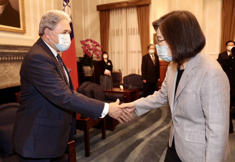 總統蔡英文(圖右)6日在總統府接見紐西蘭前副總理兼外長皮特斯(Winston Peters,另譯:彼特斯) (圖左)等第6屆玉山論壇訪賓,歡迎他們來訪台灣。(圖/中央社)