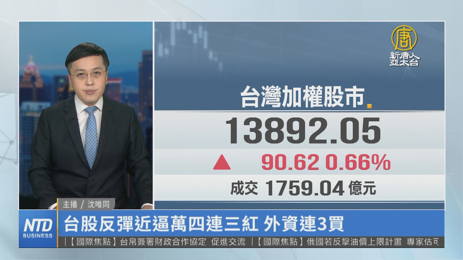 【新唐人亞太台 2022 年 10 月 06 日訊】新聞一開始帶您關心,美國聯準會官員持續升息鷹派言論,美股連二天反彈後,週三拉回,美股四大指數多為小跌,不過費半指數收漲0.94%,台積電ADR收盤大漲2.29%。台股方面,台積電今天開高5.5元至450.5元,帶領台股同步上揚,終場上漲90.62點,收在13892.05點,站穩十日線,外資也擴大加碼力道,今天買超127億元,是連續第三天買超。