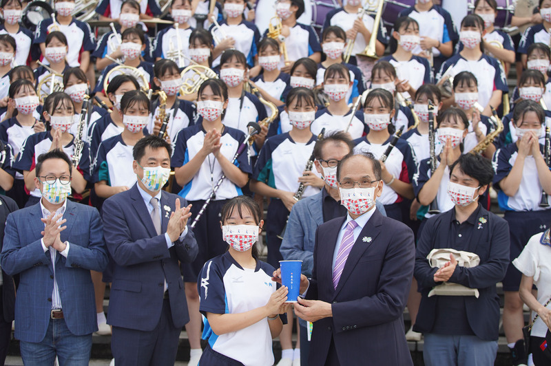 日本京都橘高校吹奏部應邀將於雙十國慶大典演出,6日下午在兩廳院戶外廣場彩排。擔任國慶籌備委員會主任委員的立法院長游錫堃(前右)到場致意,並送上台灣特色飲品珍珠奶茶給學生。(圖/中央社)