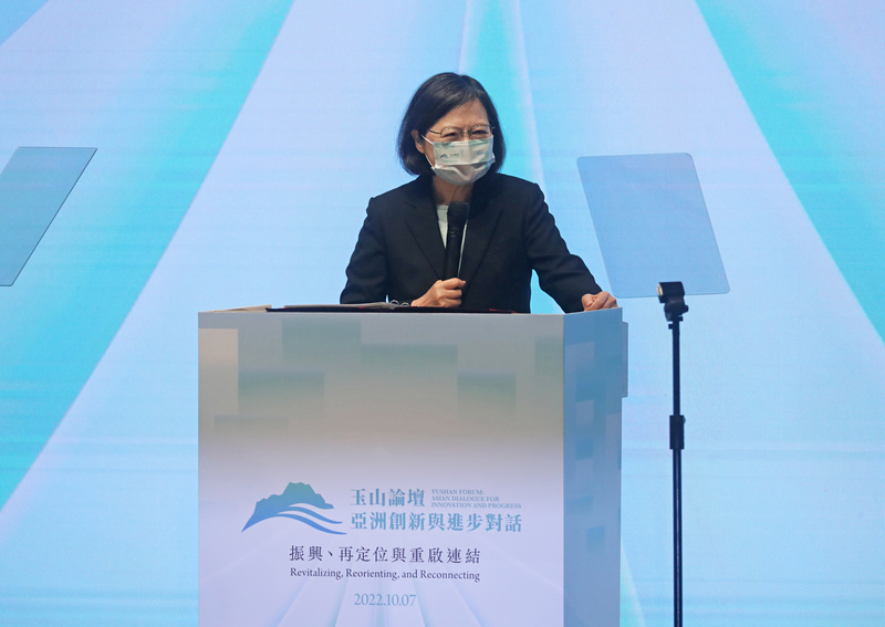 財團法人台灣亞洲交流基金會7日在台北美福大飯店舉行第6屆「玉山論壇」,總統蔡英文(圖)出席開幕式致詞。(圖/中央社)