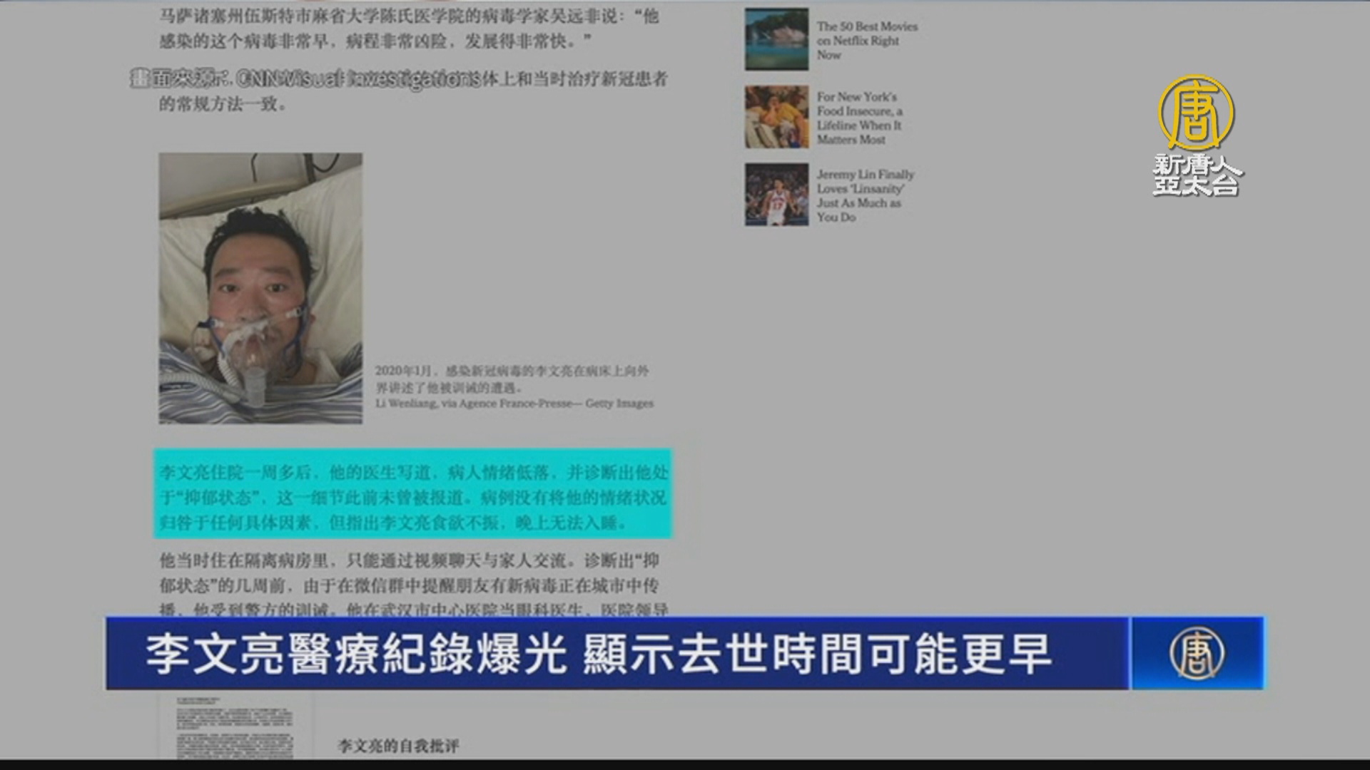 【新唐人亞太台 2022 年 10 月 07 日訊】中共病毒吹哨人李文亮,染疫去世2年多,外媒紐約時報引述一名李文亮同事的敘述,揭露李文亮當時的就醫細節,時間線顯示,李文亮實際死亡時間,可能早於官方公布的時間。李文亮是最早提出Covid-19病毒具有傳染性的人之一,並在發聲後受到中共當局的訓誡。