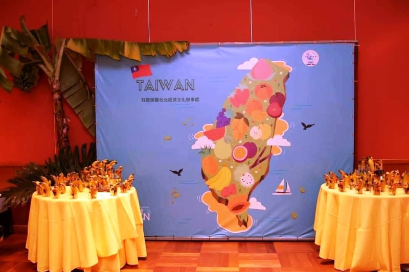 駐聖保羅辦事處6日晚間舉行中華民國111年國慶酒會,會場設置以台灣農產品為主題的打卡區供賓客拍照打卡。(圖/駐聖保羅辦事處提供)