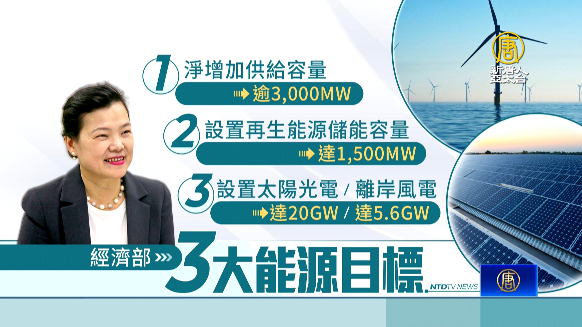 【新唐人亞太台 2022 年 10 月 08 日訊】淨零碳排趨勢下,台灣積極發展再生能源。經濟部長王美花表示,在2025年底前要達到3大目標,包括淨增加供給容量、設置再生能源儲能設施。那麼這將帶動電動車發展,產值上看6000億元。