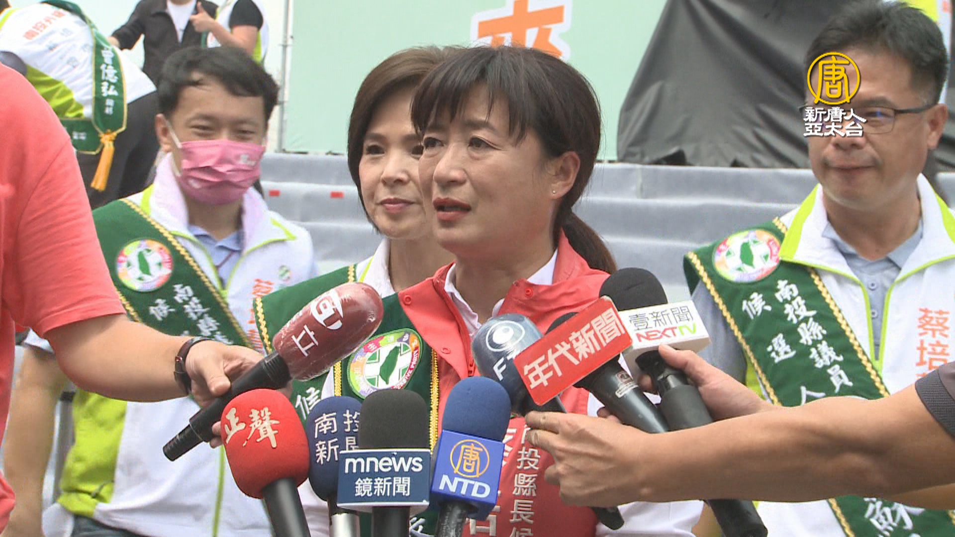 【新唐人亞太台 2022 年 10 月 08 日訊】九合一選戰倒數48天,南投縣長藍綠兩黨之爭進入白熱化。民進黨南投縣長參選人蔡培慧今天(8日)成立競選總部,包括行政院長蘇貞昌、內政部長徐國勇、農委會主委陳吉仲,還有金曲歌后詹雅雯都同台助選。