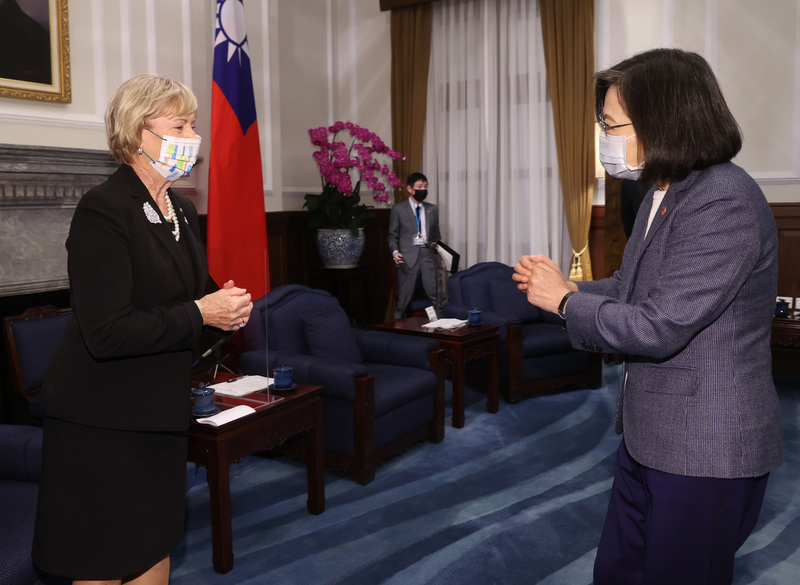 台加國會議員友好協會會長暨眾議院國貿委員會主席、加國眾議員史葛洛(圖左)(Judy Sgro)晉見總統蔡英文時說台灣是世界非常有價值的夥伴,是經濟穩定強健的一燈塔,對於全世界的和平穩定不可或缺。(圖/中央社)