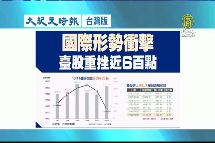 【新唐人亞太台 2022 年 10 月 12 日訊】接著看到大紀元時報台灣版報導:國際形勢衝擊,台股重挫近600百點。