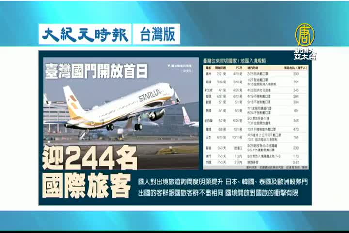 【新唐人亞太台 2022 年 10 月 13 日訊】接著看到大紀元時報台灣版報導:台灣國門開放首日,迎接244名國際旅客。