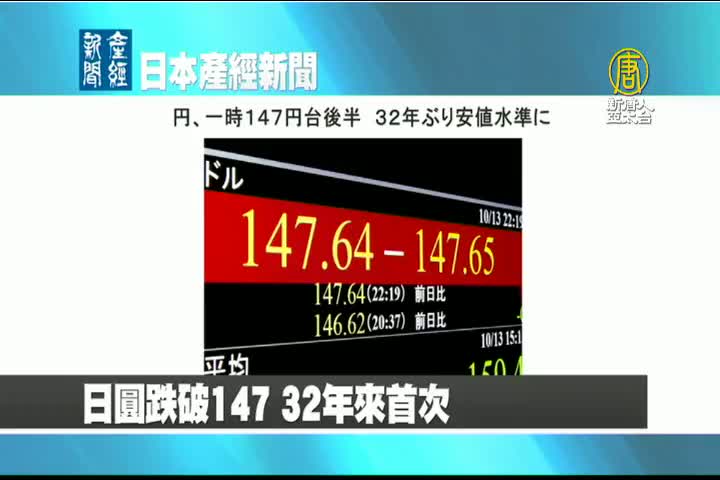 【新唐人亞太台 2022 年 10 月 14 日訊】來看到日本產經新聞報導:日圓持續下跌,13日跌破147兌1美元,是32年來第一次。