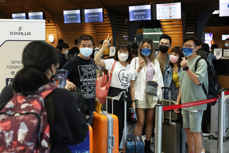 交通部長王國材14日表示,國門重啟第一天,出入境旅客總計約2.5萬人次比平常多一倍。 圖為13日邊境鬆綁,13日上午桃機第一航廈民眾開心合影慶出遊。(圖/中央社)