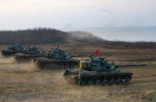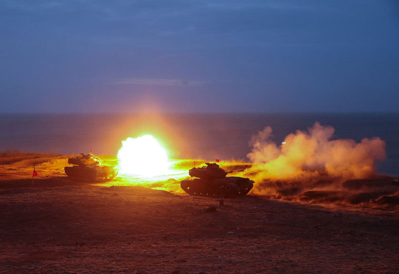 陸軍澎湖防衛指揮部19日清晨實施「鎮疆操演」實彈射擊,各項武器相輔相成,全程透過實戰化演練,充分發揮高效能聯合打擊能力。圖為M60A3戰車集火對海射擊。(圖/中央社)