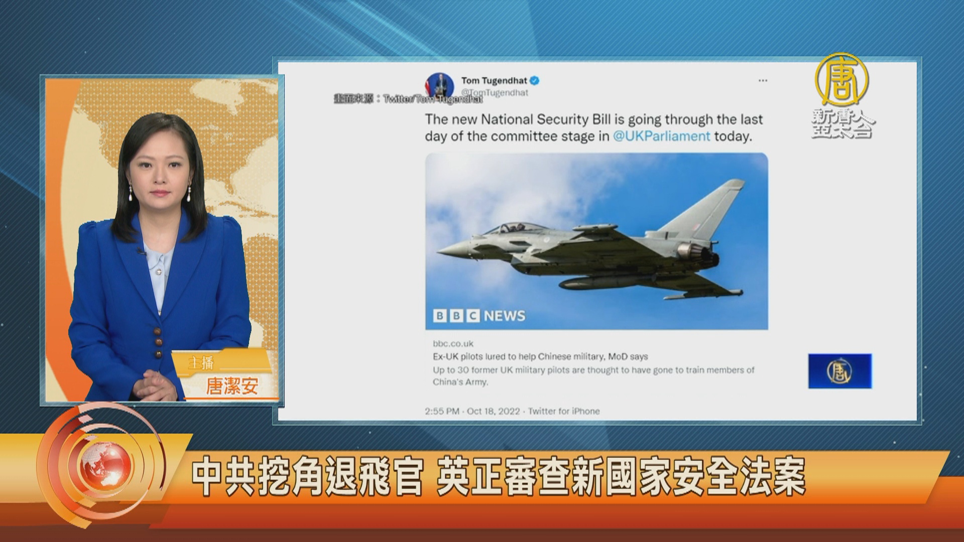 【新唐人亞太台 2022 年 10 月 19 日訊】中共透過第三地,高薪挖角英國退役飛官,英國國防情報局,罕見發布「威脅警報」,阻止中共的招募行為。另外,英國安全部長圖根哈特,也在推特上轉發這條新聞,他寫道,新的國家安全法案即將在委員會通過,預告英國將對中共有更高的警覺防堵。