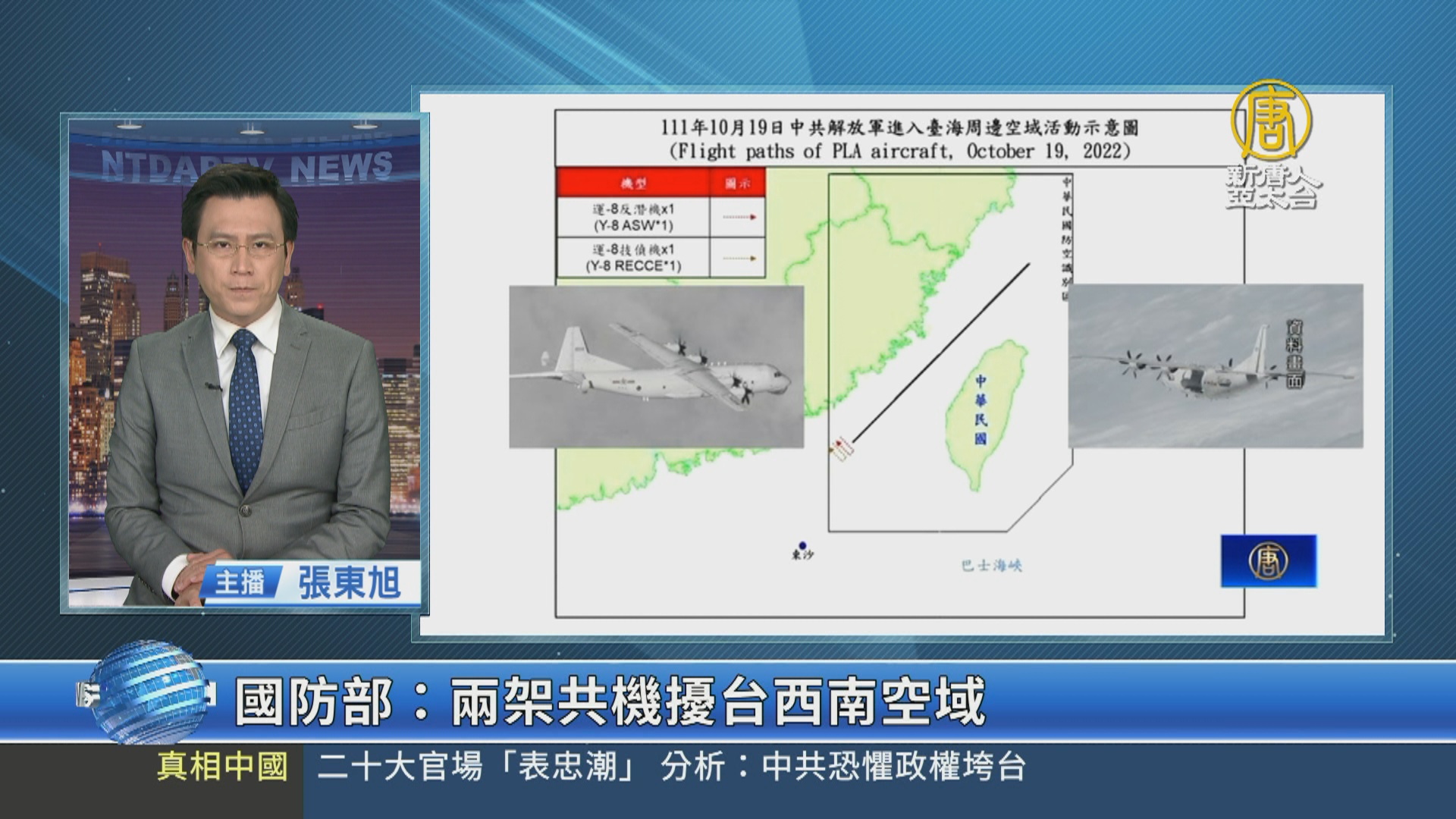 【新唐人亞太台 2022 年 10 月 19 日訊】國防部今天(19日)表示,偵獲共機11架次、共艦2艘,持續於台灣周邊海空域活動。其中2架共機進入台灣西南空域,國軍運用任務機、艦及岸置飛彈系統嚴密監控與應處。國防部長邱國正今天表示,中共20大期間以內部維穩為目標,因此共軍並未在台海出現異常徵候。