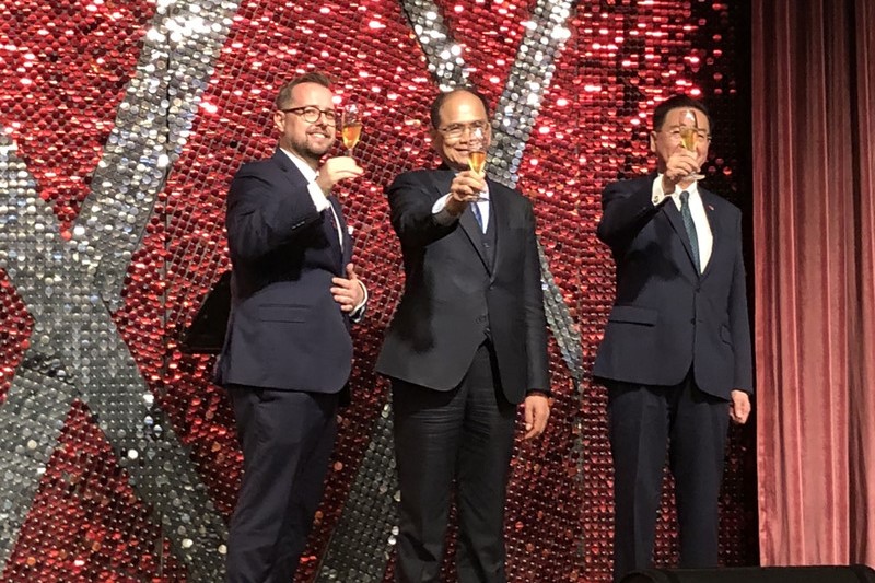 立法院長游錫堃 (中)、外交部長吳釗燮(右)、捷克駐台代表史坦格(David Steinke)(左)19日共同出席捷克國慶酒會,舉杯慶賀。(圖/中央社)