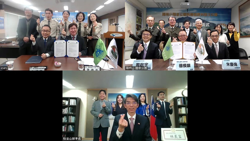 台灣內政部營建署、外交部亞太司、陽明山國家公園管理處、駐釜山辦事處與韓國國立公園公團、慶州國立公園管理所等各單位代表今天也透過視訊會議共同見證簽約儀式。