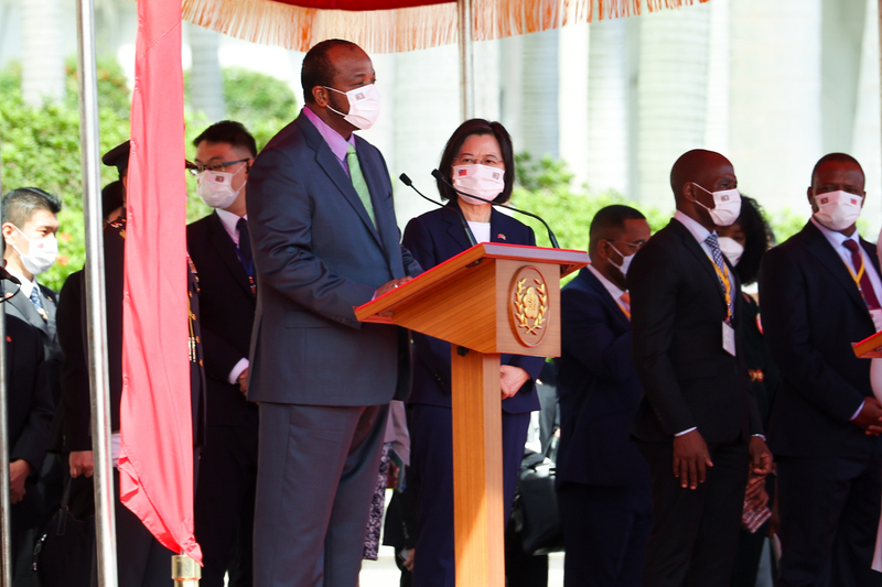 非洲友邦史瓦帝尼國王恩史瓦帝三世(King Mswati III)(圖前左)訪台,總統蔡英文(圖前左2)21日在總統府前主持軍禮迎接,恩史瓦帝三世致詞時說會繼續呼籲聯合國讓台灣參與相關活動。(圖/中央社)