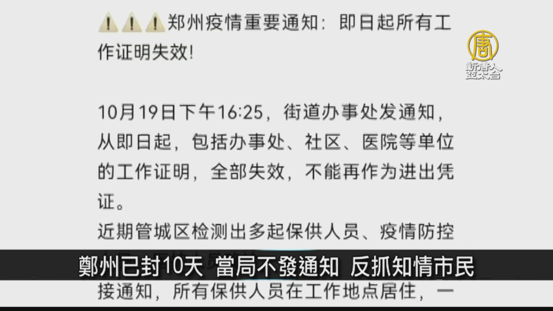 中共二十大前,鄭州疫情升溫。鄭州官方19日才發佈消息稱,鄭州即日起實施3天封控管理。當地民眾卻反映,其實早在8日就開始實施封城了,已實際封城至少10天,然而官方遲遲未發封城通知。當地有網民還因發布鄭州將封城(靜默管理)的消息被官方抓捕,官方稱靜默管理是「謠言」。