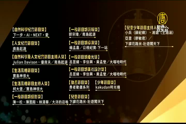 【新唐人亞太台 2022 年 10 月 21 日訊】帶您看到金鐘獎最新得獎名單, 節目「下一步,AI。NEXT,愛」,拿下自然科學紀實節目獎;節目「南島起源」拿下人文紀實節目獎及主持人獎、以及剪輯獎;節目「寶島神很大」拿下生活風格節目獎及主持人獎,「大洋的召喚」拿下一般節目類攝影獎;節目「公視紀實-下一站」拿下一般節目類導演獎,節目「大嘻哈時代」拿下燈光以及美術設計獎。「勇者動畫系列」拿下動畫節目獎。「下課花路米」獲得兒童節目獎後,再拿下兒童少年節目主持人獎。原住民族電視台節目「kakudan時光機」奪得少年節目獎。