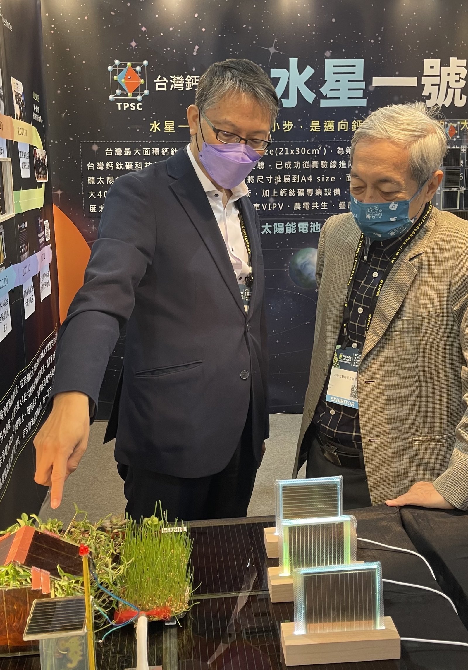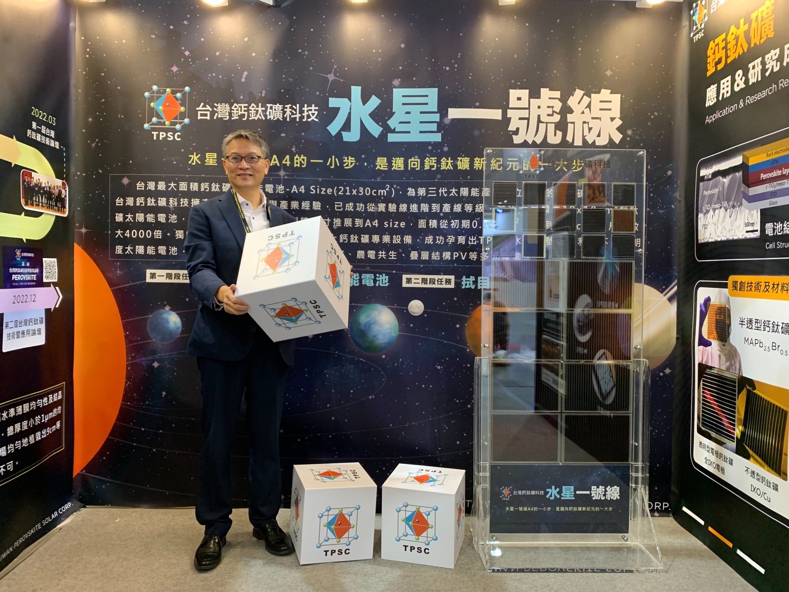 此次TPSC展出的『水星一號線』代表具量產設計的大面積鈣鈦礦太陽能電池試產線,結合了獨特創新的材料、製程技術與專業設備的完整方案。同時展出了三種不同型態的鈣鈦礦太陽能電池,包括電極穿透型、半透型與不透型太陽能電池。董事長陳來助指出,現有太陽能板應用在建築一體化(BIPV)以及農電共生,難免受限於其不透光特性而有所限制,可透光太陽能板為產業帶來更廣泛的應用,建築物不再局限於屋頂而是整體建築外觀都可發電,為實現零碳建築向前跨了一大步,而農(漁)電共生應用也將不受限於特定耐蔭作物與特定養殖業,對於發展綠電所需的土地問題有很大的幫助。
