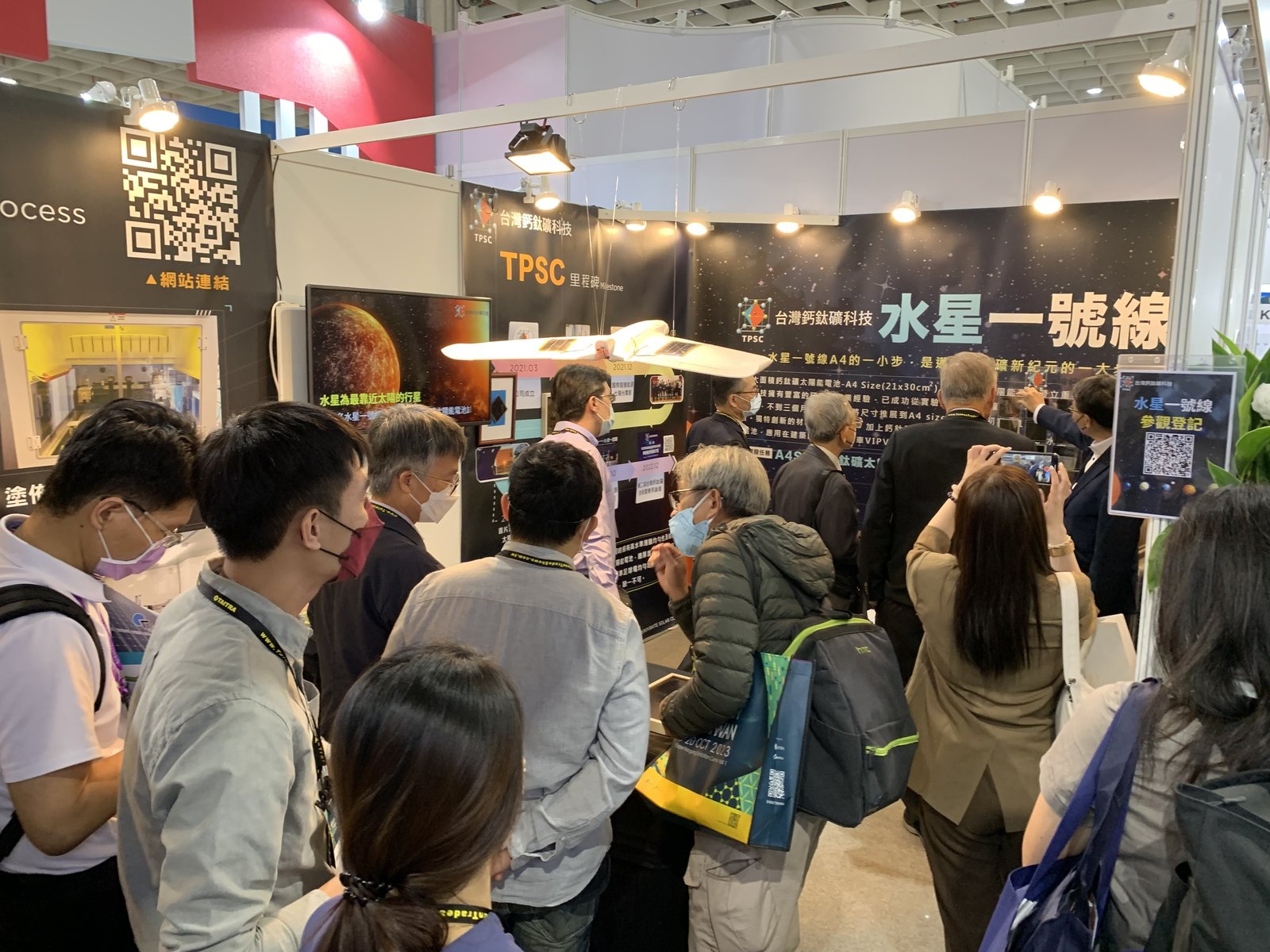 整個太陽光電展場中,絕大多數為矽晶太陽能產業鏈相關企業,台灣鈣鈦礦科技(TPSC)參展在其中是絕對亮點之一,被稱為下一代太陽能產業的新星-鈣鈦礦太陽能,TPSC展出了台灣最大面積A4 size鈣鈦礦太陽能電池,並稱之為『水星一號線』,為第三代太陽能產業樹立了重要的里程碑。