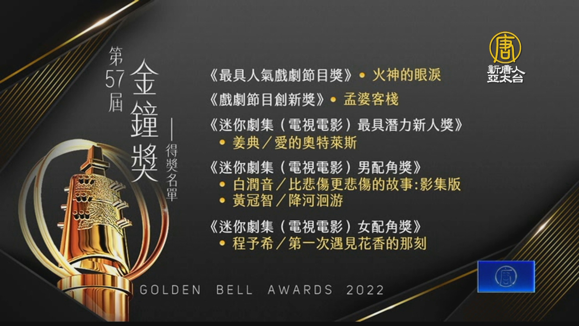 【新唐人亞太台 2022 年 10 月 22 日訊】新聞首先來看到,第57屆金鐘獎戲劇類獎項在今晚正式開獎,台灣多部好劇入圍,而率先開出的「最具人氣戲劇節目獎」,由《火神的眼淚》拿下。《孟婆客棧》運用歌仔戲演出歌舞情境喜劇,拿下「戲劇類節目創新獎」。首次擔任男主角的姜點,以戲劇《愛的奧特萊斯》,獲得「迷你劇集最具潛力新人獎」。「迷你劇集男配角獎」,今天更開出雙蛋黃,包括《比悲傷更悲傷的故事::影集版》13歲演員白潤音,以及戲劇《降河洄游》的黃冠智獲獎。「迷你劇集女配角獎」則是由程予希以戲劇《第一次遇見花香的那刻》拿下。