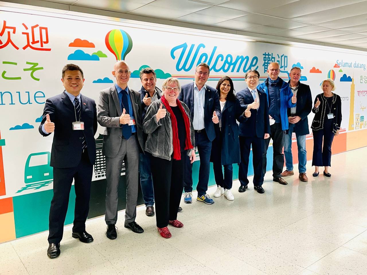 外交部23日上午在官方推特發布照片指出,歡迎10月第2團德國國會團訪台,外交部次長蔡明彥(圖右四)、德國駐台代表許佑格(圖左二)(Jorg Polster)前往接機。(圖/翻攝自twitter@MOFA_Taiwan)