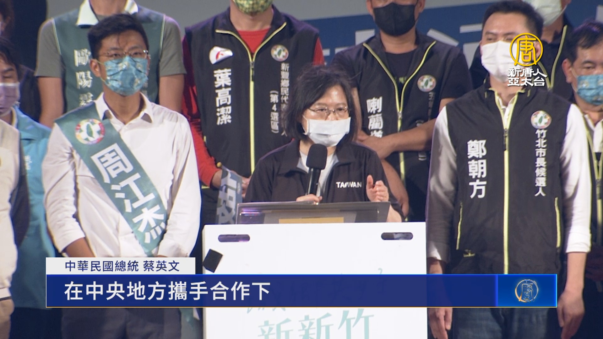【新唐人亞太台 2022 年 10 月 23 日訊】總統蔡英文週六(22日)在高雄及台中,分別為陳其邁及蔡其昌造勢後,傍晚趕到新竹縣,為民進黨新竹縣長候選人周江杰站台,強調中央地方能一起快步向前改。