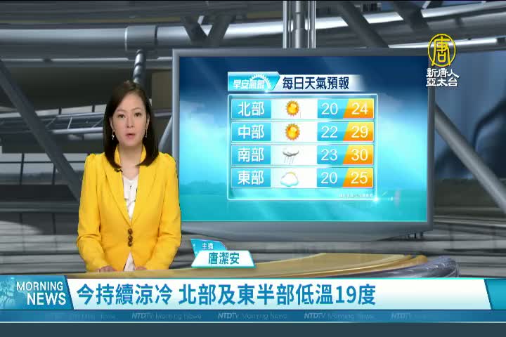 【新唐人亞太台 2022 年 10 月 24 日訊】歡迎您收看10月24日的早安新唐人,我是唐潔安,先來帶您關心天氣。今明兩持續受東北季風影響,水氣減少、氣溫偏涼,北部、東半部低溫約攝氏19、20度。其他地區約26至30度;中南部觀眾朋友,要留意日夜溫差大。帶您一起來看到國際媒體重要訊息。