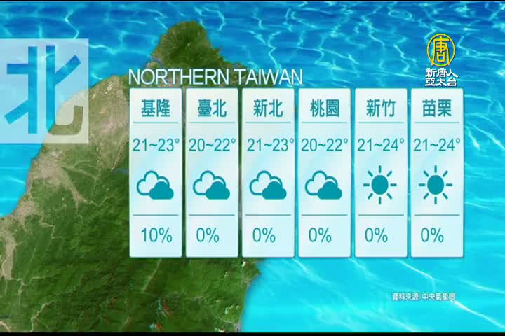 2022-10-24 08:20:51歡迎您收看10月24日的早安新唐人,我是唐潔安,先來帶您關心天氣。今明兩持續受東北季風影響,水氣減少、氣溫偏涼,北部、東半部低溫約攝氏19、20度。其他地區約26至30度;中南部觀眾朋友,要留意日夜溫差大。帶您一起來看到國際媒體重要訊息。