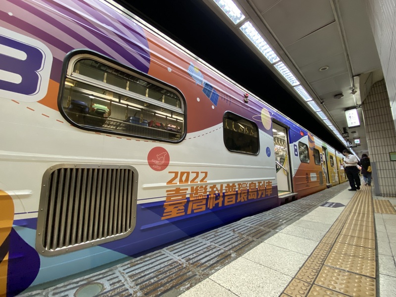 2022台灣科普環島列車以台鐵列車改造而成,繪有今年活動主題的塗裝。(圖/中央社)