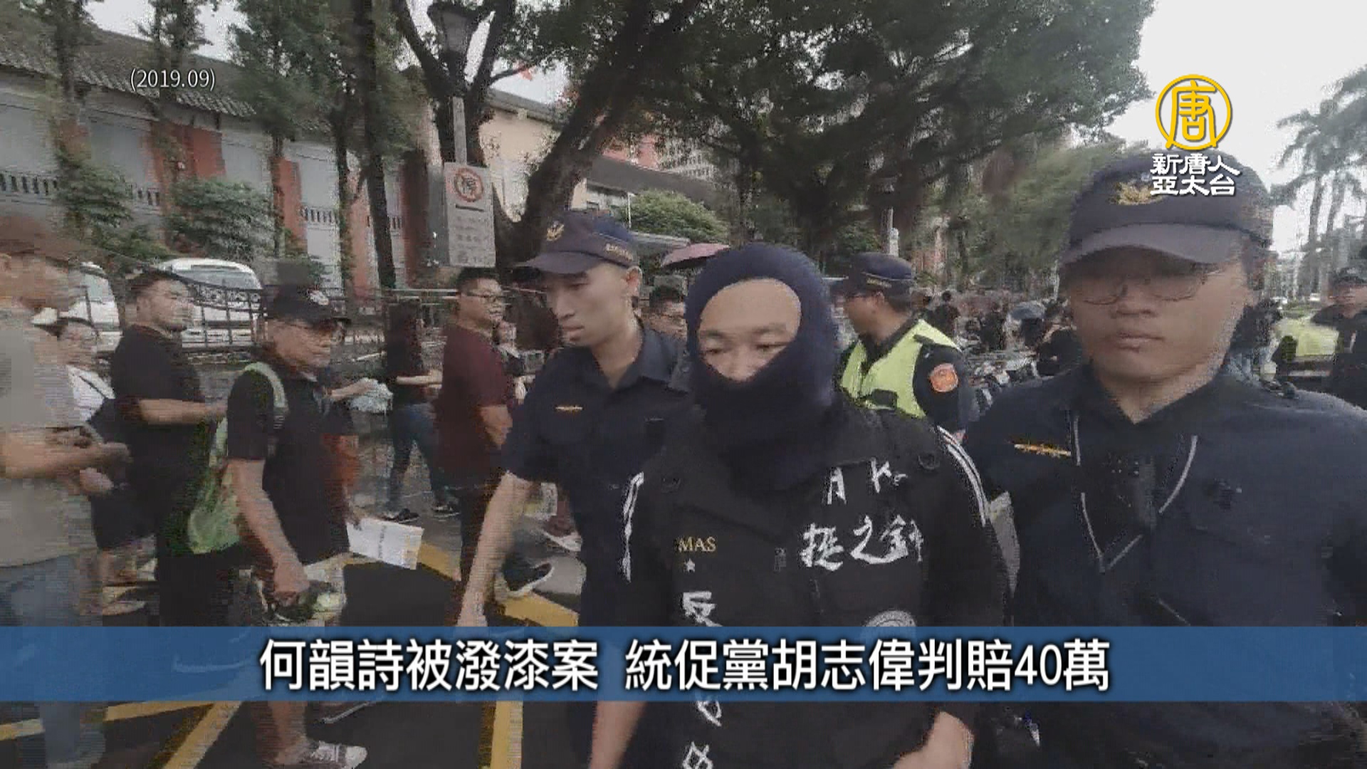 香港藝人何韻詩3年前來台參與「撐港反極權,929台港大遊行」,接受聯訪時遭統促黨自忠黨部幹部胡志偉從她頭頂潑紅漆,高等法院刑庭依毀損罪判胡有期徒刑3月,可易科罰金9萬元定讞;台北地院民庭24日再判胡應賠償何40萬元,可上訴。