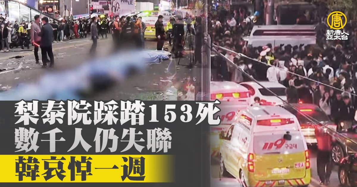 【新唐人亞太台 2022 年 10 月 31 日訊】早安新唐人先帶您聚焦,南韓首爾商圈,上週末,29日舉辦萬聖節活動,卻爆發推擠踩踏事故,目前已造成153人死亡,死者多為20多歲的年輕人,還包括未成年女性,截至台灣時間昨天傍晚,失蹤個案超過四千起。南韓總統尹錫悅下令全國致哀一週。綜藝節目、藝人公演多宣布暫停。