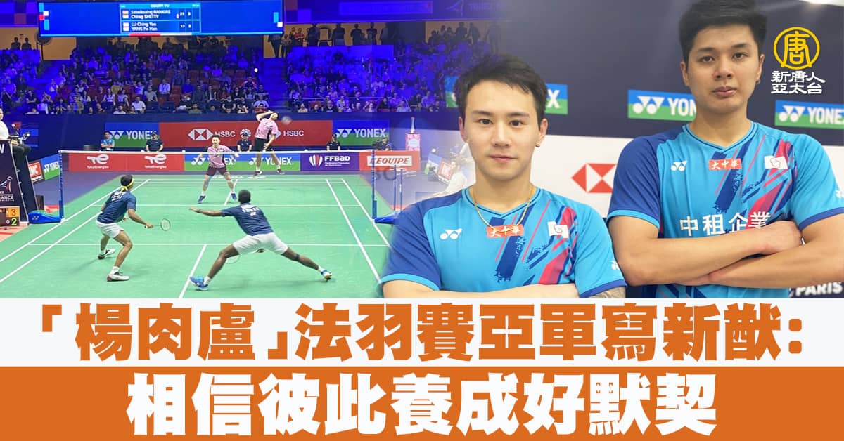 【新唐人亞太台 2022 年 10 月 31 日訊】台灣男雙黑馬組合楊博涵與盧敬堯今天出戰法國羽球公開賽決賽,以亞軍寫下超級750系列賽最佳成績。原本差點拆夥的兩人告訴中央社,這次表現意義重大,會珍惜彼此默契並繼續加油。