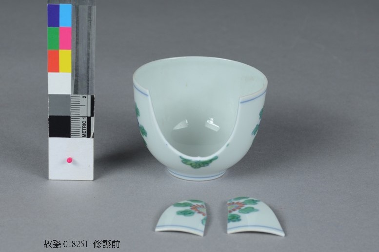 故宮表示,11月上旬將全面公開已完成數位資料建置的文物修護各項紀錄,提供外界檢視閱覽。成化款白地彩花瓷杯修護前。(圖/故宮提供)