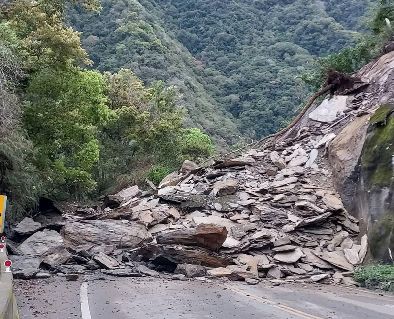 南橫公路台東段189K+700處、嘉寶隧道附近,2日清晨5時許坍方,約25公尺長的路面遭土石掩埋,土石堆高約4公尺,道路中斷。(圖/關山工務段提供)