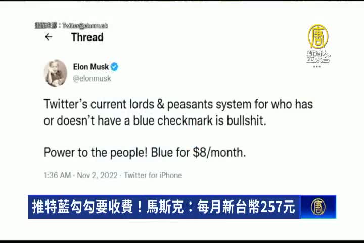 【新唐人亞太台 2022 年 11 月 02 日訊】推特新老闆馬斯克(Elon Musk)上任後,迅速執行整頓行動,除了裁員計畫外,週二(1 日)宣布,每月向有藍色勾勾身分認證的用戶,收取約8 美元(約新台幣約257元)的使用費。馬斯克強調,Twitter Blue的價格會隨著每個國家/地區的購買力來調整。並表示,Twitter Blue訂戶在「回覆、標記和搜尋」時也可以獲得「優先權」,馬斯克稱這對「打擊垃圾帳戶與詐騙不可或缺」。外媒更透露,馬斯克帶著至少50位特斯拉工程師到推特協助接管。預計一週內重新設計Twitter的訂閱和驗證系統。