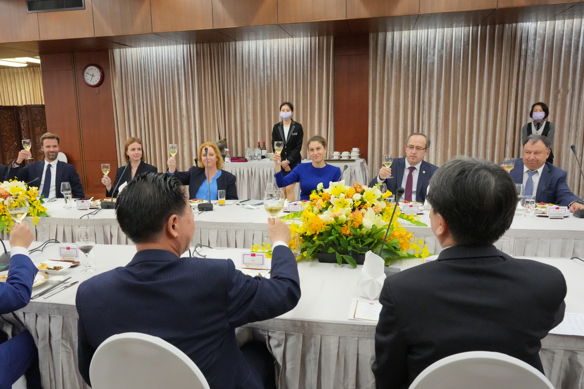 對華政策跨國議會聯盟(IPAC)組團訪台,遭中共制裁荷蘭眾議院議員史卓瑪說他此行想向北京釋出的訊息是,他和國際民主人士會更加堅定跟台灣團結一起。圖為1日外長吳釗燮舉杯敬IPAC訪台成員照。(圖/翻攝自外交部網頁)