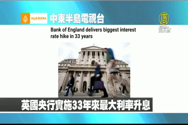 【新唐人亞太台 2022 年 11 月 04 日訊】來看到半島電視台報導:英國央行週四將基準利率上調至3%,為30年來最大規模升息,並警告英國經濟可能正處於持續兩年的衰退中。