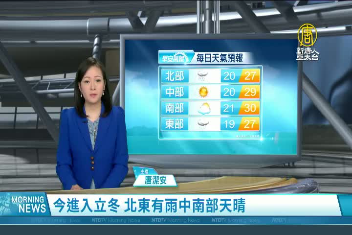 【新唐人亞太台 2022 年 11 月 07 日訊】歡迎您收看11月7日的早安新唐人,我是唐潔安,先來帶您關心天氣。今天進入24節氣中的立冬,是很多人進補的時機,未來一週氣溫大多在20至30度之間。北北基、東半部有局部短暫雨,宜蘭北海岸時有較大雨勢,桃園以南則是秋高氣爽,但要注意日夜溫差,提醒早出晚歸的觀眾朋友,適時添加衣物。帶您一起來看到國際媒體重要訊息。
