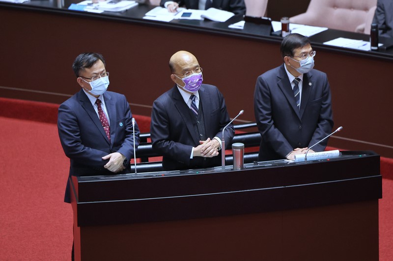 立法院會8日進行施政總質詢,行政院長蘇貞昌(中)、交通部長王國材(右)、NCC主委陳耀祥(左)列席並備質詢。(圖/中央社)