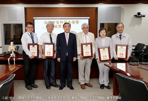 法務部今天下午舉行媒體茶敘,趁12日醫師節前夕,由部長蔡清祥頒發「特殊貢獻獎」表揚4名法醫師以及1名矯正署特約醫師。