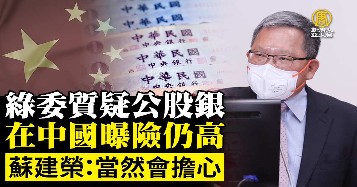 【新唐人亞太台 2022 年 11 月 09 日訊】民進黨立委郭國文今天立法院財政委員會質詢時,指公股銀行在中國曝險3310億元,他問財政部長蘇建榮,會不會擔心。對此,蘇建榮說,「我當然會擔心」,也一直提醒公股行庫要注意。