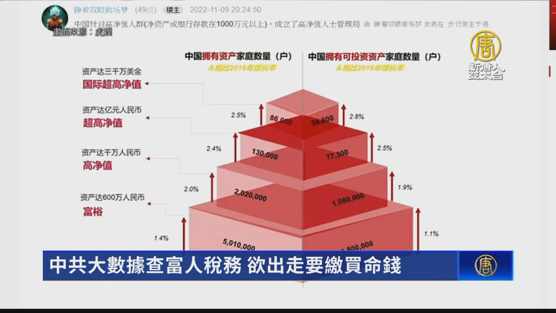 【新唐人亞太台 2022 年 11 月 10 日訊】中共政府今年財政赤字暴漲,似乎將矛頭對準富人階層。當局被揭露,成立「高淨值人群管理局」,針對富人群體,利用大數據開展專項稅務稽查,而且出走海外的富人,必須出具清稅證明,有評論認為中共當局近期力推公有化,是對民間財富的新一輪搶劫。