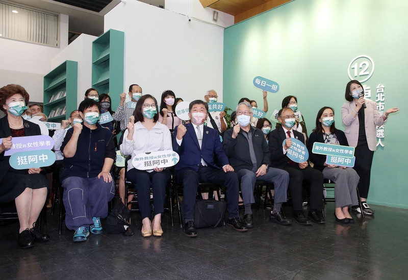 民進黨台北市長候選人陳時中(圖前排左4)14日上午出席「海外學者、女性學者挺阿中」記者會,多名學者出席表態力挺陳時中,為陳時中加油打氣。(圖/中央社)