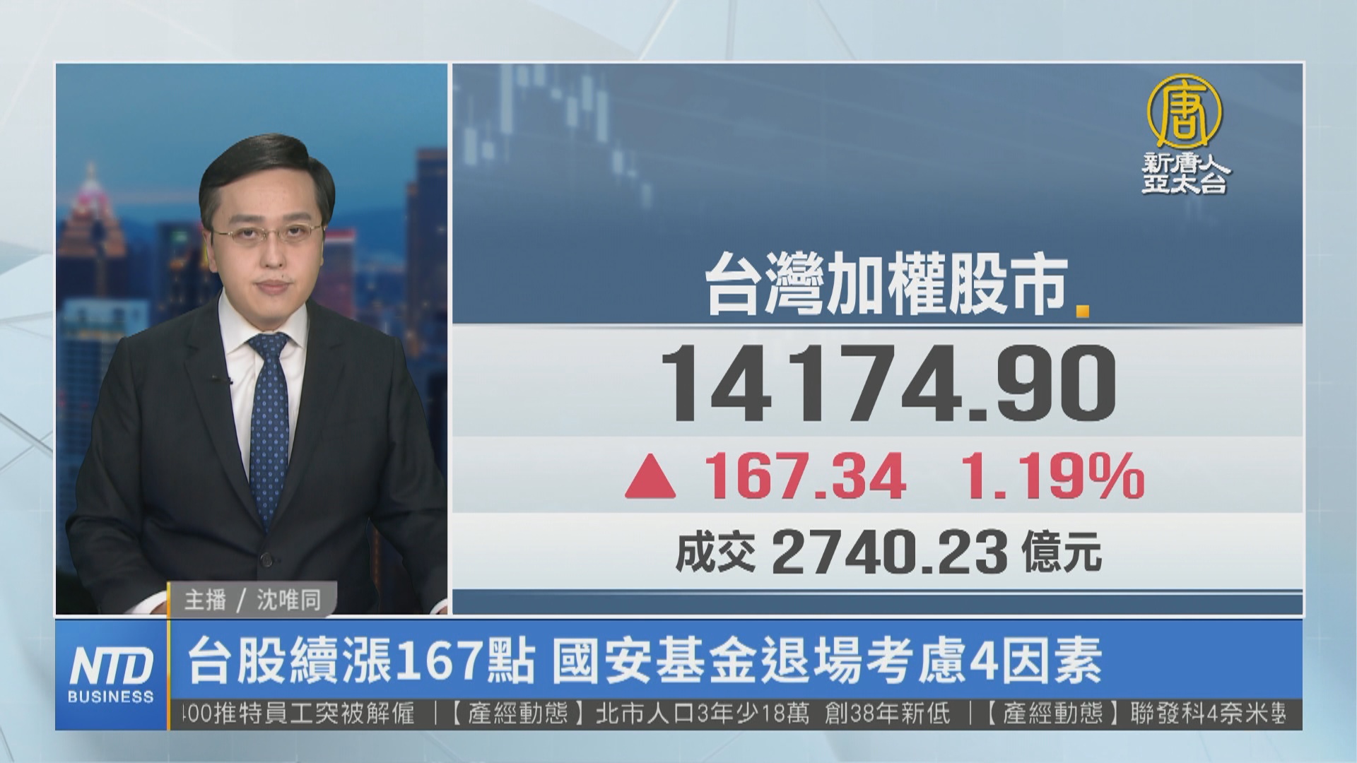 【新唐人亞太台 2022 年 11 月 14 日訊】新聞先來關心國際股市,美國通膨數據放緩後,市場普遍預估12月Fed將升息2碼,明年升息步伐有望再放緩,週五美股延續漲勢,標普500指數創6月以來最佳單周表現,台股周一,盤中指數一度大漲209點,不過短線獲利賣壓調節下,終場上漲167.34點,收在14174.9點。財政部長蘇建榮今天表示,台股指數目前站回萬四,不過國際間,包括Fed升息、美中科技戰、俄烏戰爭、中國清零4大不確定因素還是存在,國安基金是否退場要綜合考量,會等到季度會議再決議。