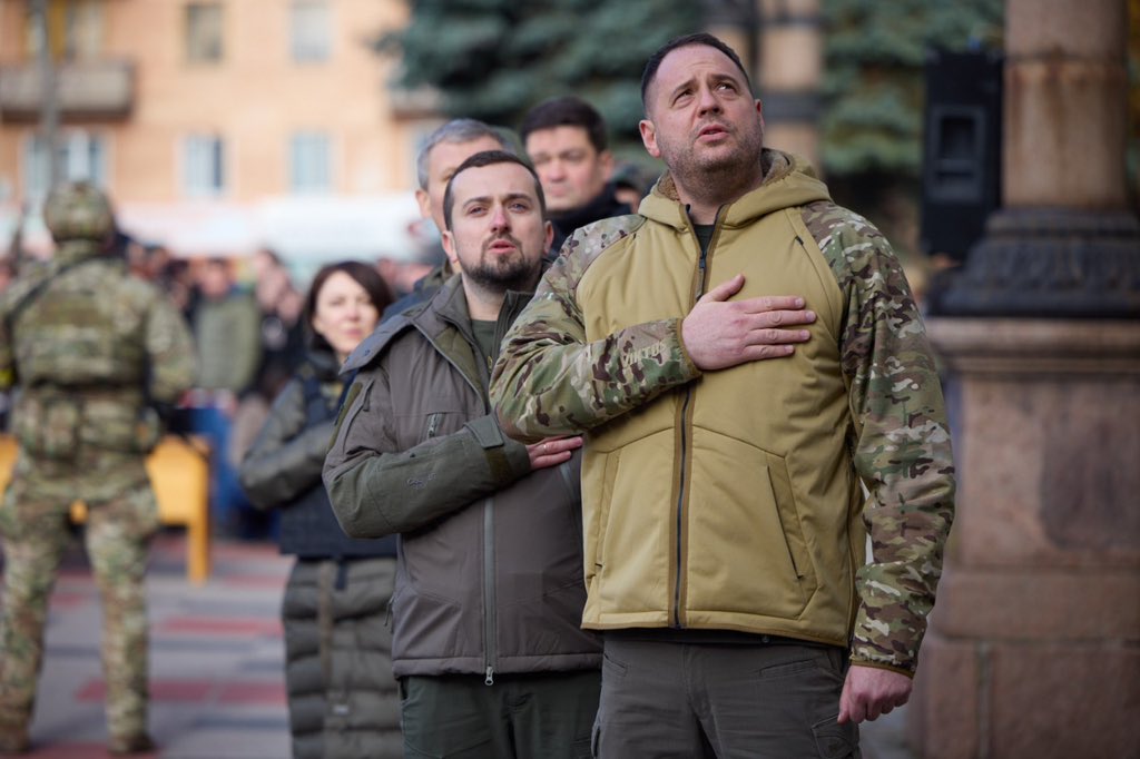 澤倫斯基的幕僚長葉爾馬克(Andriy Yermak)提供的照片顯示,當烏克蘭藍黃色國旗在赫松市行政大樓旁冉冉升起時,澤倫斯基單手置於胸前,高唱烏克蘭國歌。